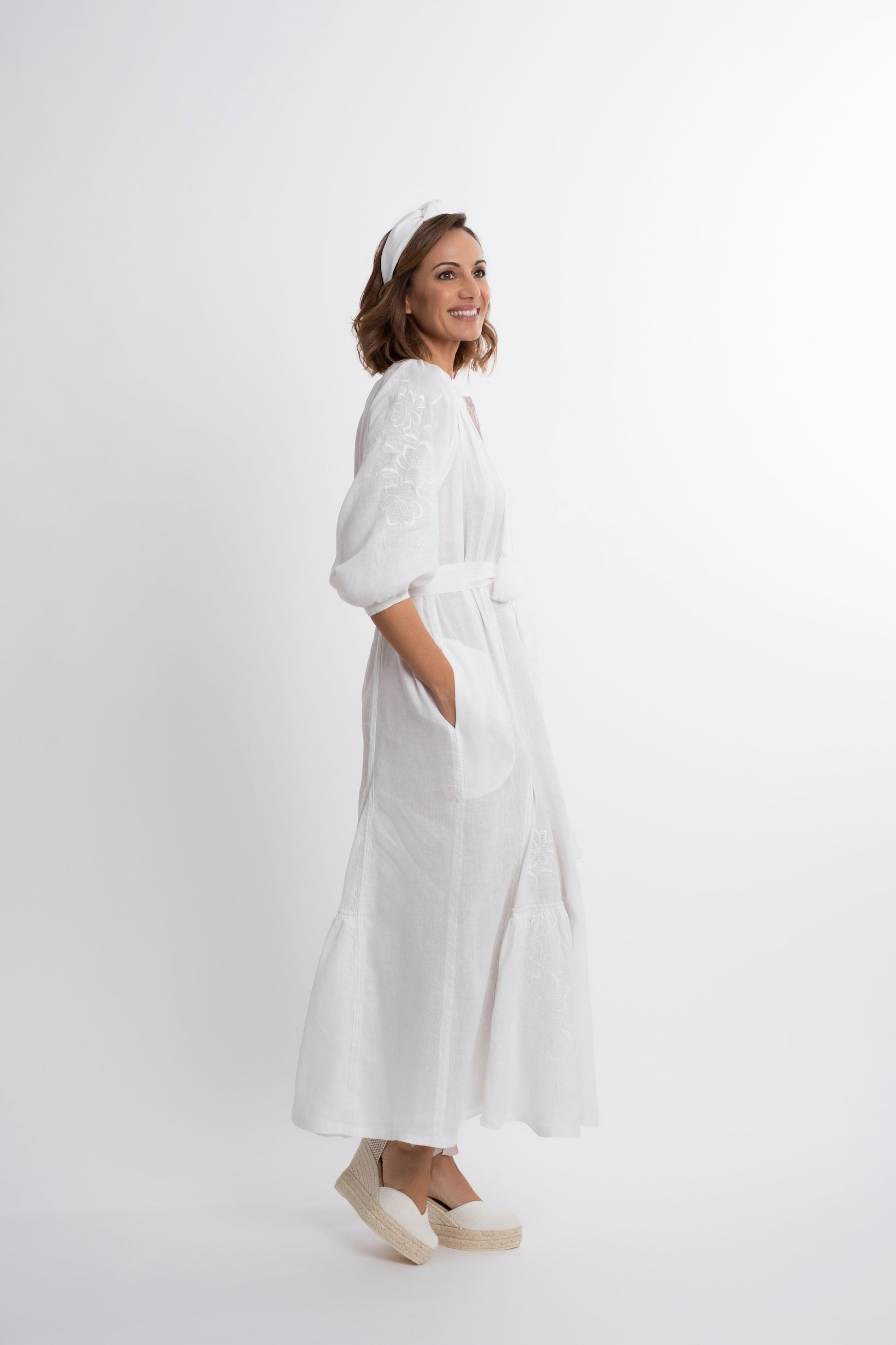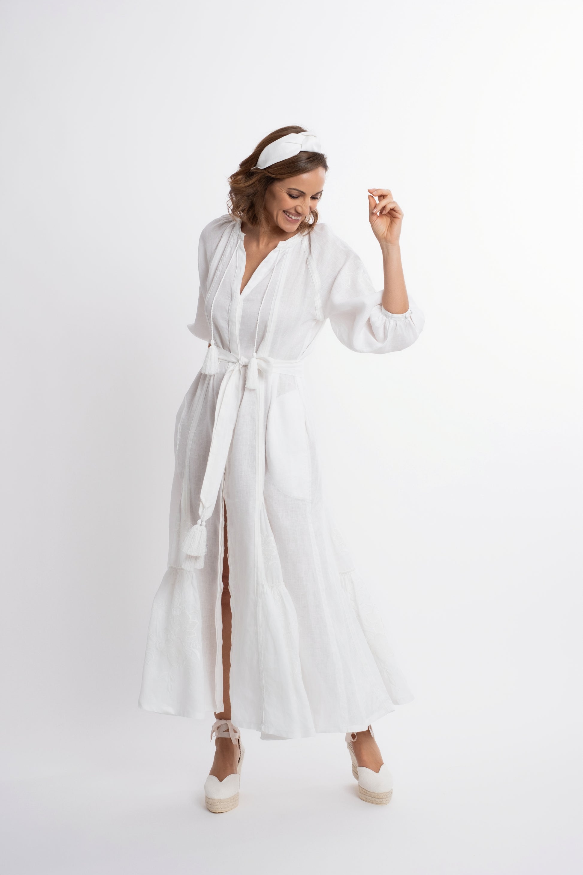 Ibiza: Vestido de lino blanco bordado con cinturón, pompones y botones de nácar.