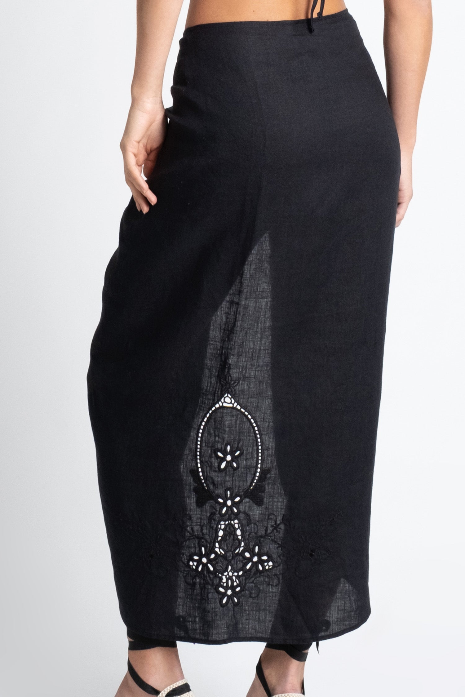 Este elegante pareo de lino negro bordado cuenta con un bordado suizo tradicional que combina estilo y comodidad. El diseño de talla única lo hace perfecto para un día en la playa o un evento al aire libre.