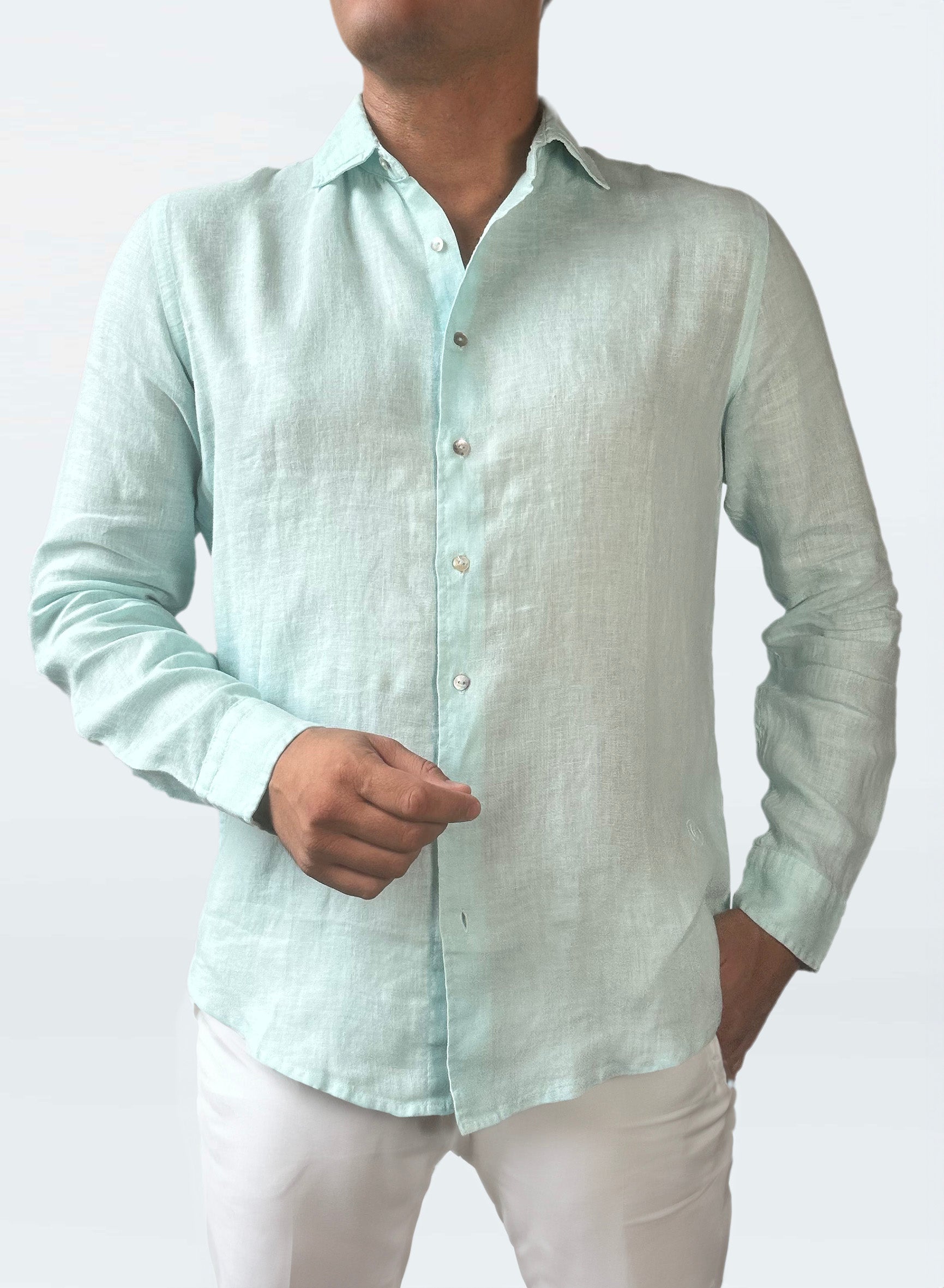 Mauricio: Camisa unisex 100% lino turquesa con botones de nácar