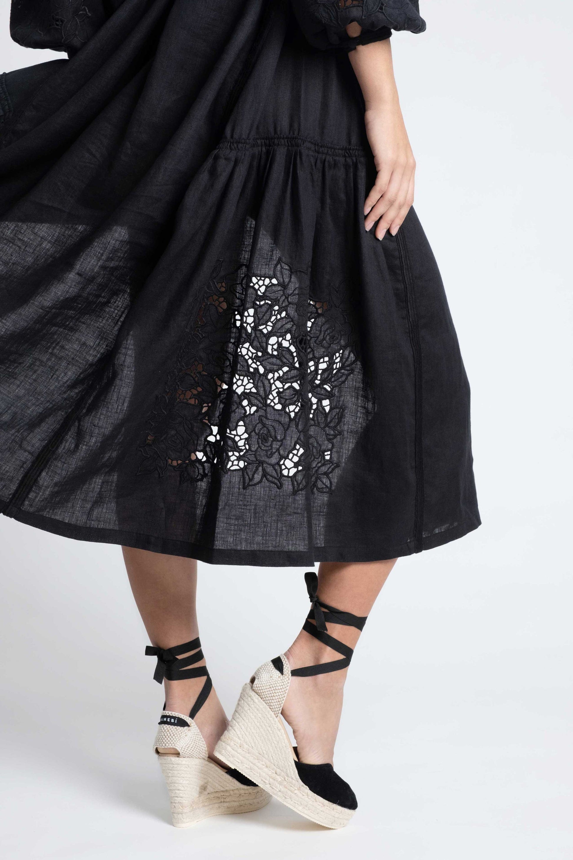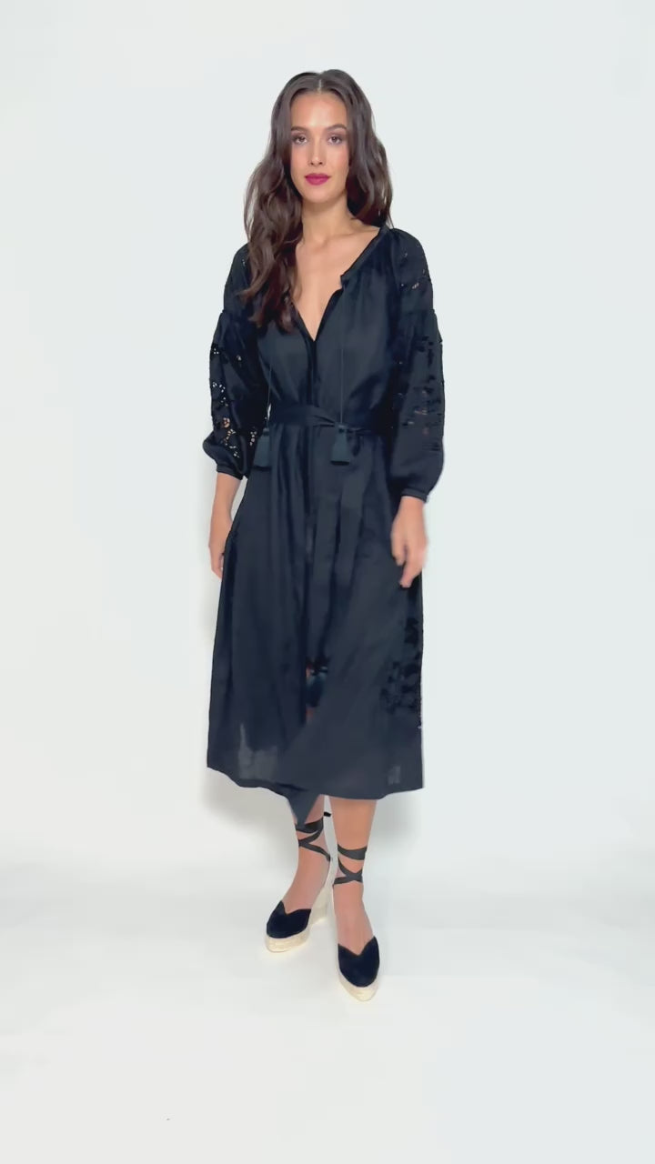 Capri: Vestido de lino negro con bordado suizo, pompones y botones de nácar.