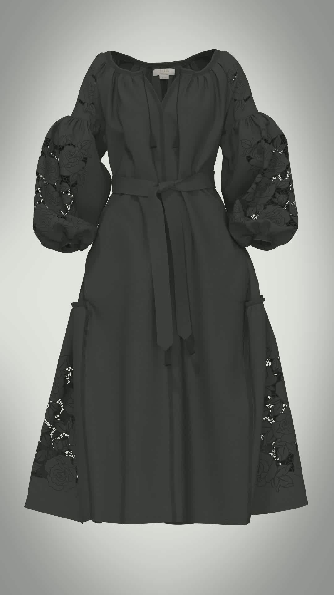 Este hermoso vestido de lino negro ha sido cortado y confeccionado con bordado suizo para una apariencia única y elegante. Tiene botones de nácar para usarlo abierto o cerrado, con talla única adecuada para tipo de mujer.