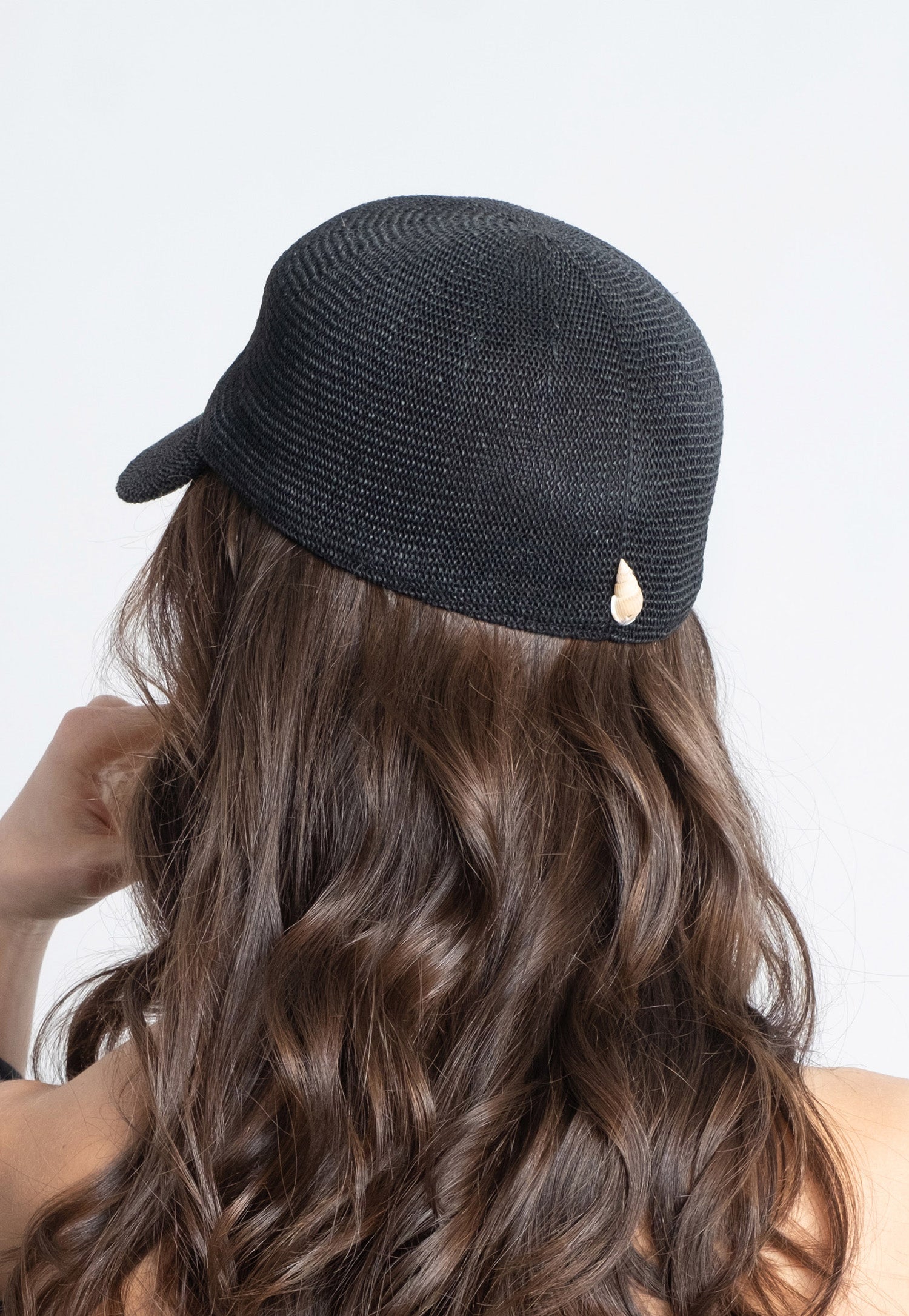 Corfú: Black straw cap with natural shell.
