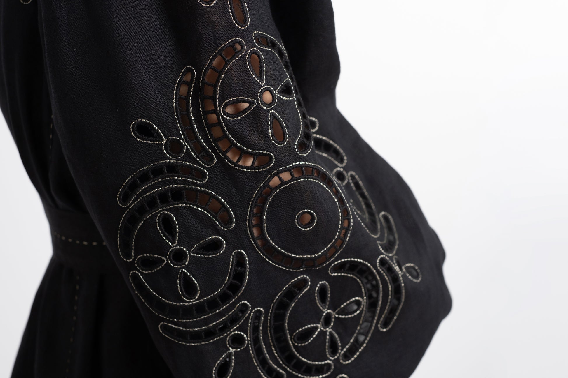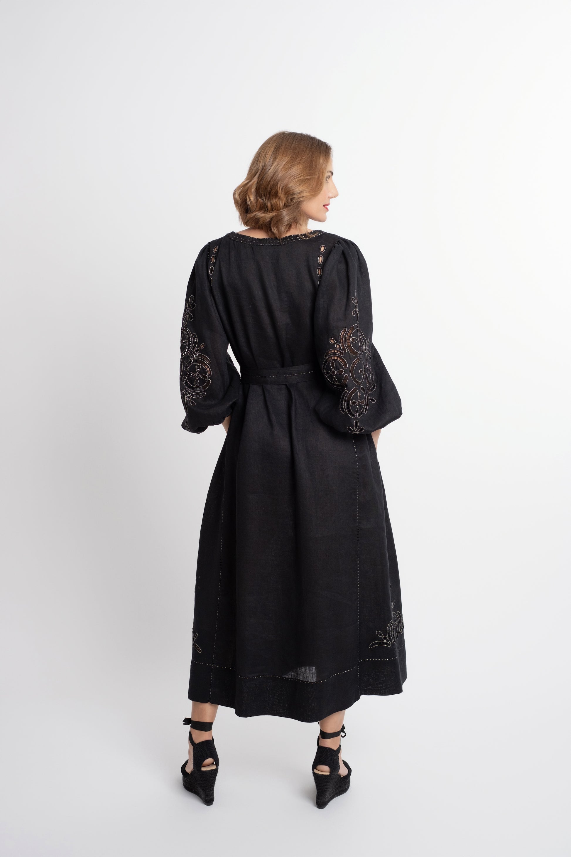 Crafted for versatility, this linen dress features black and gold embroidery with 206.721stitches, perfect for transitioning from day elegance to sophiticated night-time wear.