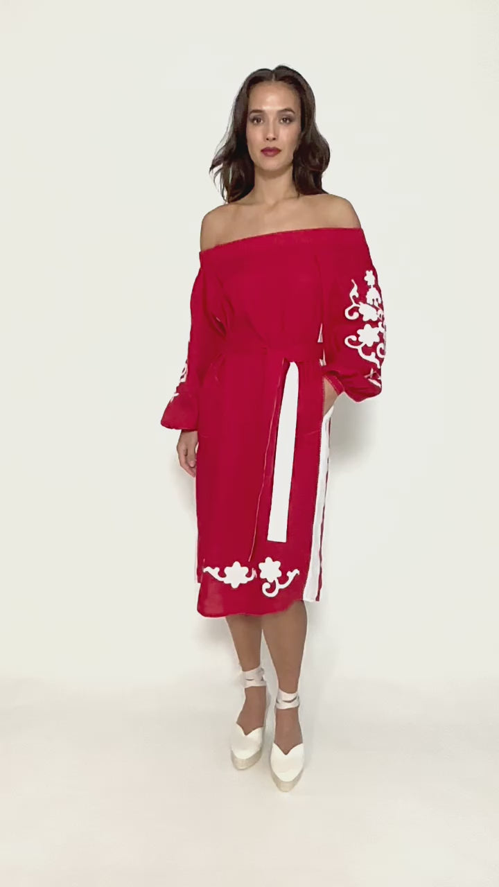 This red linen dress is the perfect combination of style and comfort. Its boat-neck design and white embroidery add a subtle touch of elegance, while its adjustable belt allows for a comfortable fit. The dress is free size and perfect for all occasions.