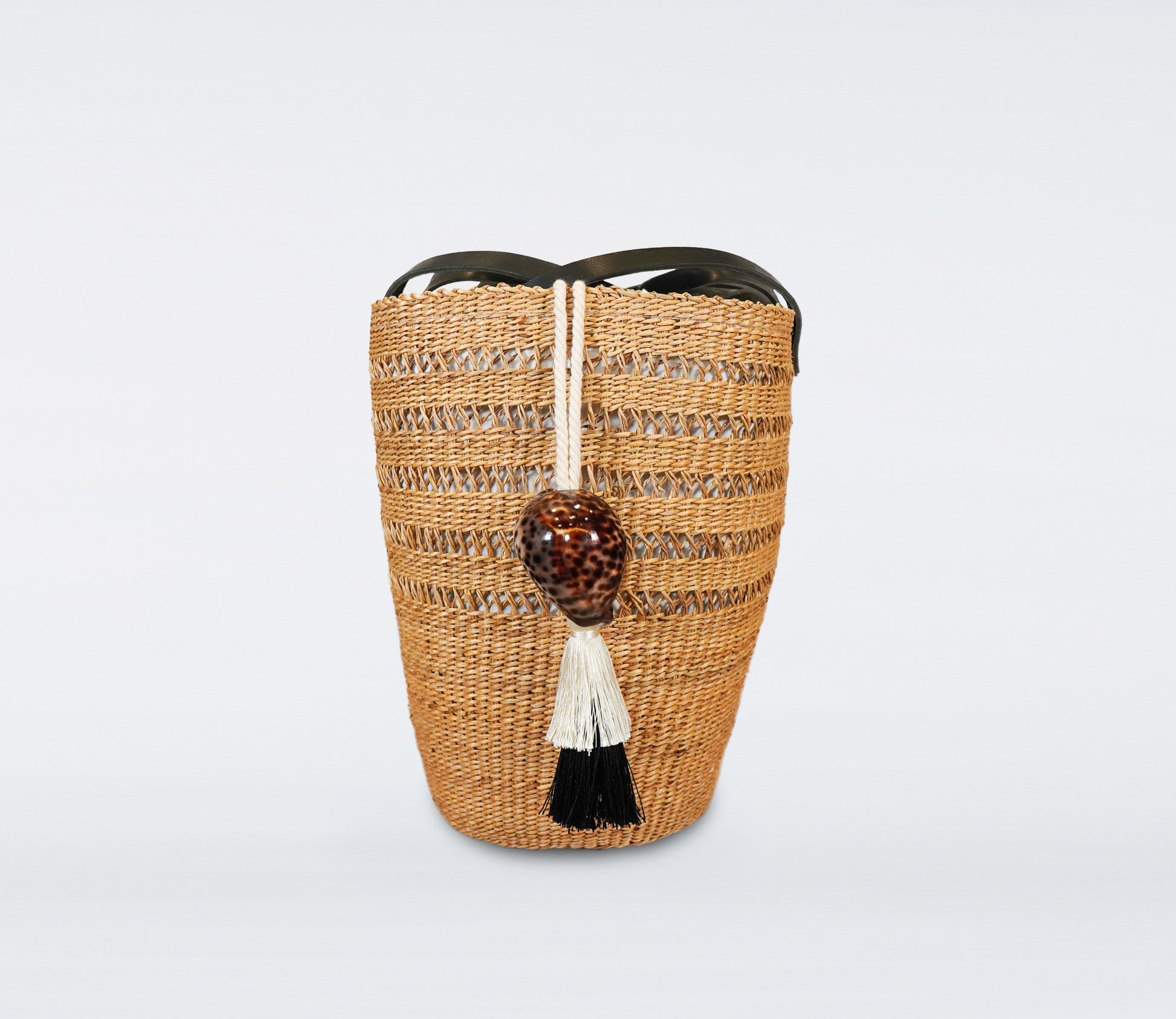 This large basket is crafted from straw for a natural look and durability. The black recycled leather handles offer a stylish and comfortable grip while the included cotton bag helps to keep the contents secure. Natural shells are interwoven for a subtle coastal vibe.