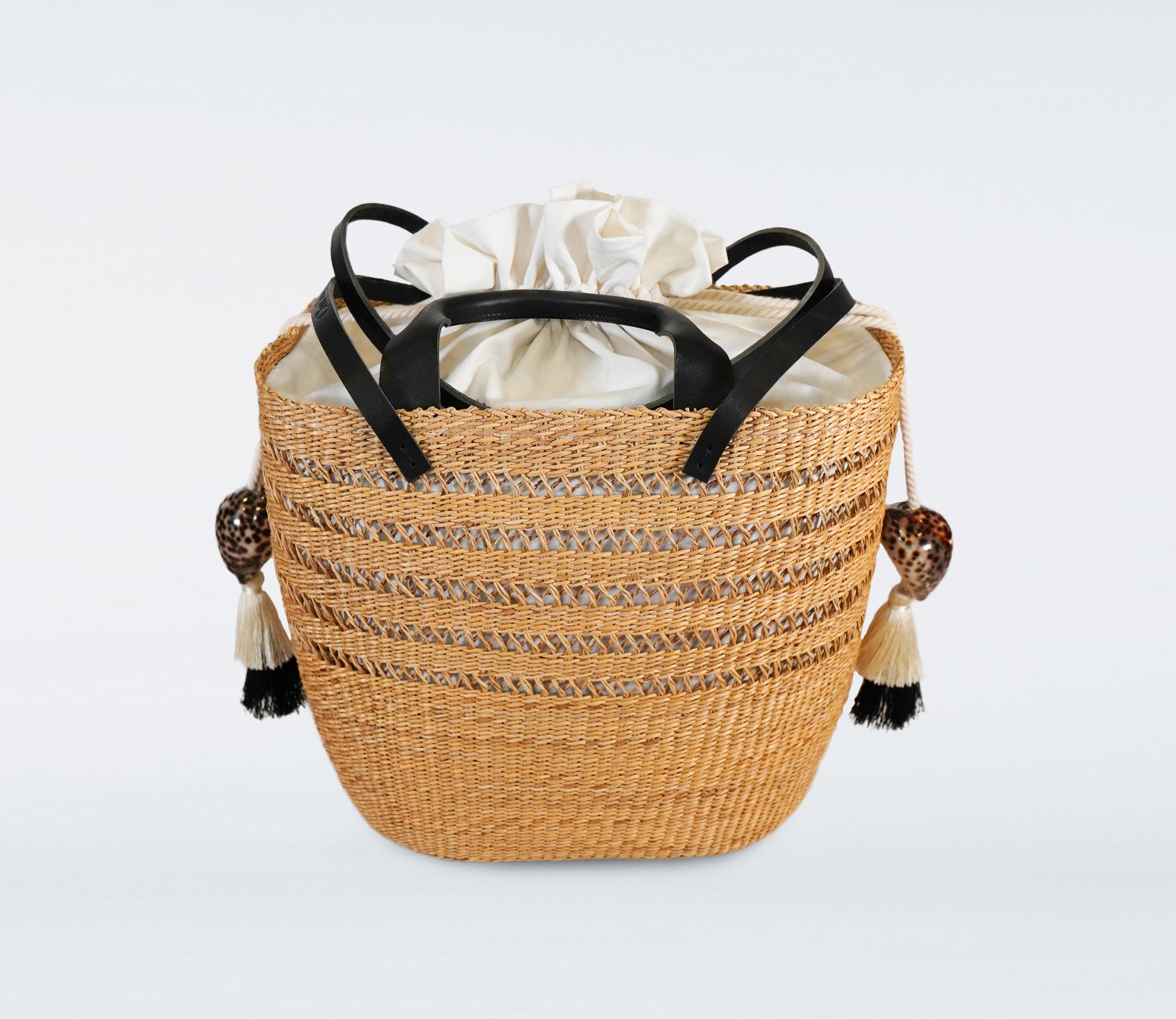 Milos: Large black basket in straw, black recycled leather handles, cotton bag and natural shells.