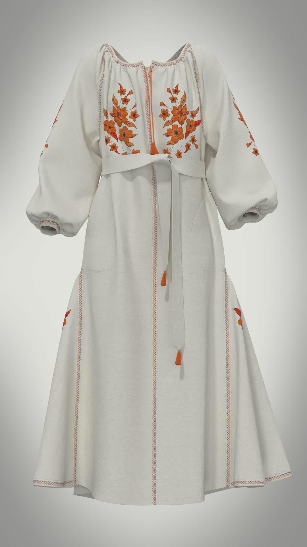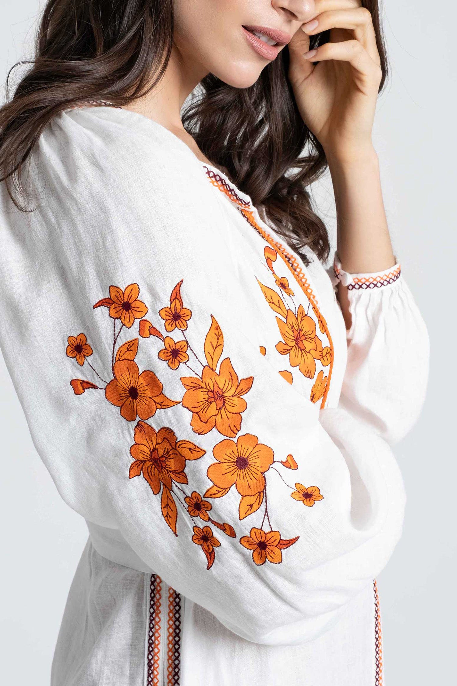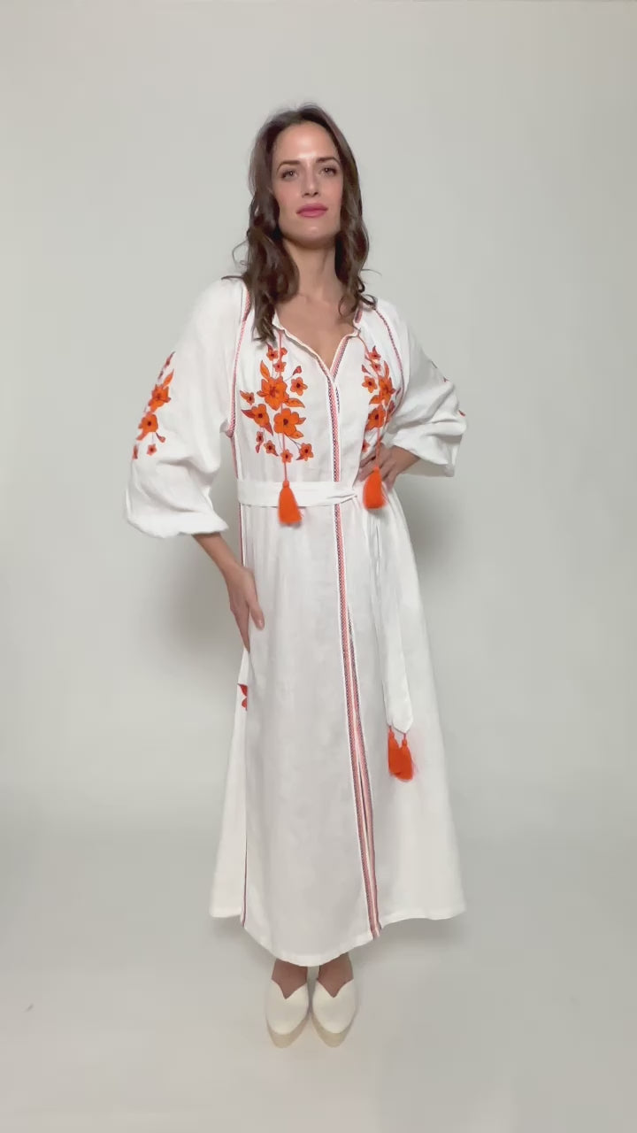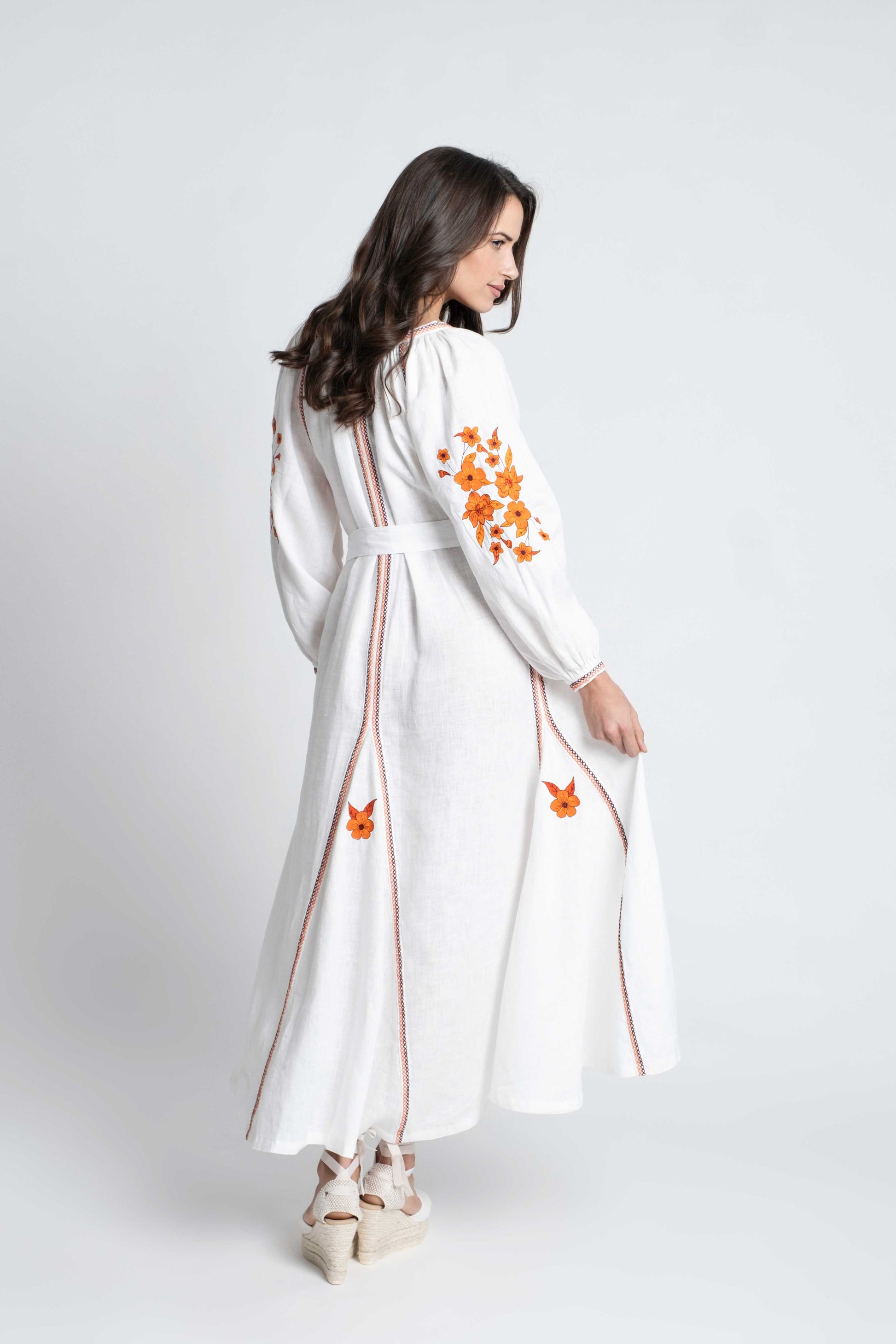 This white linen dress is a perfect combination of sophistication and elegance. It features beautiful orange flower embroidery, mother of pearl buttons, and a matching belt. Complete the look with stylish pompons for a unique and timeless finish.