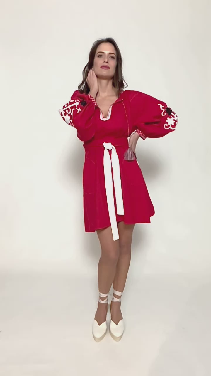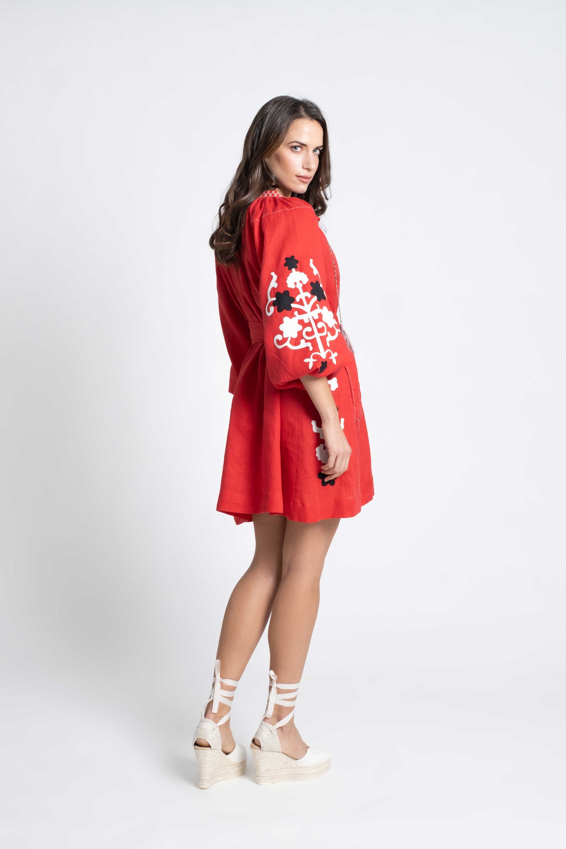 This red linen belted short dress is perfect for any occasion. Made with comfortable, lightweight fabric, it has an elegant design with black and white embroidery that adds a stylish touch. The free size design ensures a comfortable and flattering look for any woman.